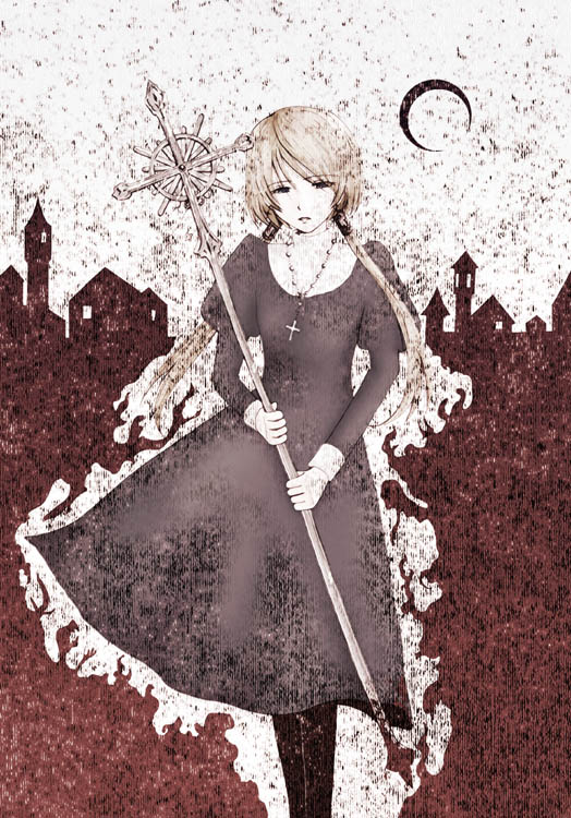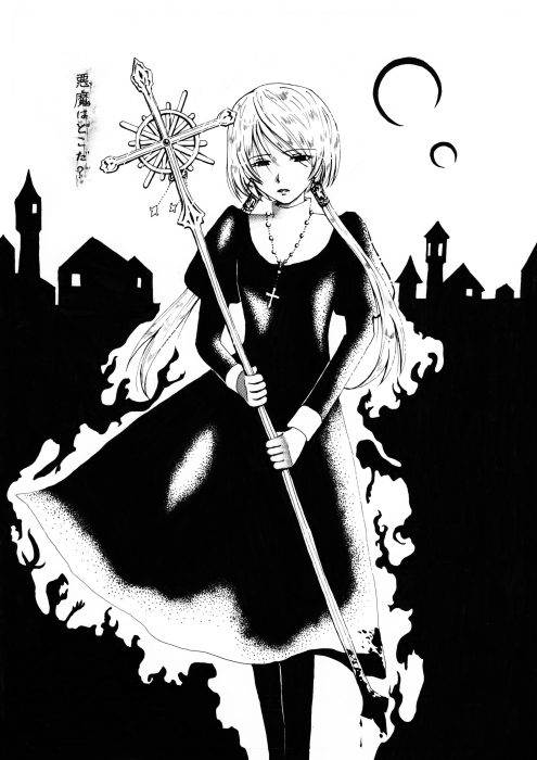 なんとなくパプテスの聖女様(というかシスター兼エクソシスト?)をイメージしながら描いていたのですが、背景を描いた途端思いっきりダークに。